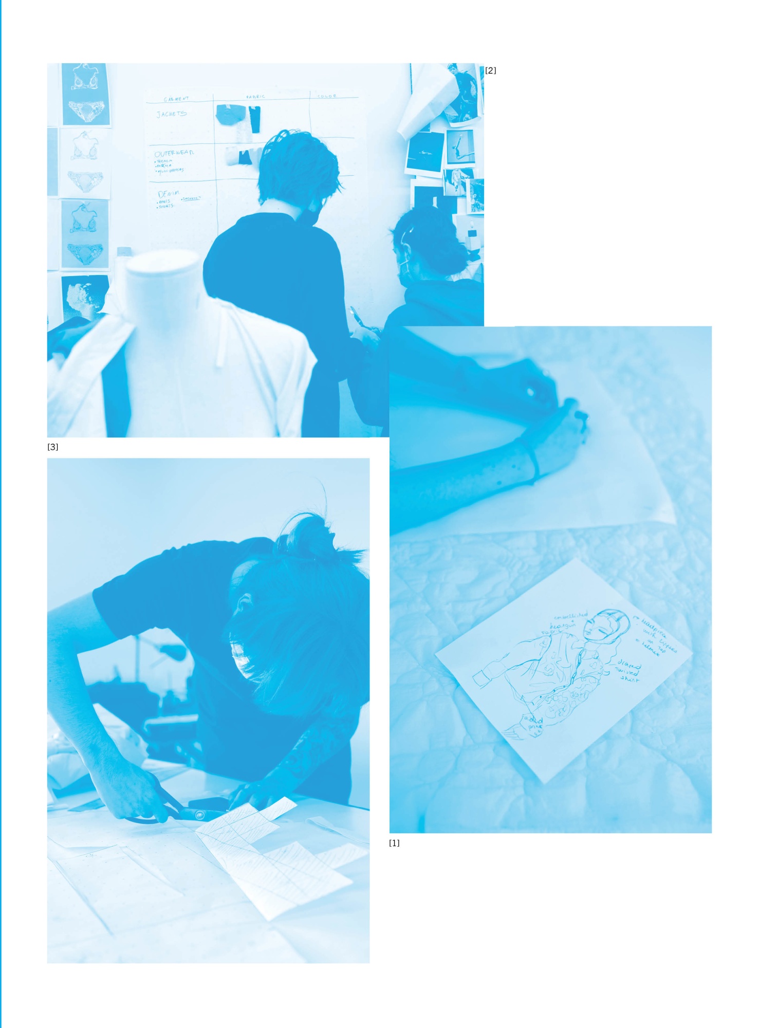 The activity was constantly observed in its evolution, from initial inputs to outputs; pictures of progress, intermediate artifacts, and pinboards used by participants to communicate tasks and ideas were collected and mapped, forming the core of the empirical PhD study material. [1] Sofia (Coupe Team, Group 3) prepares to cut fabric provided by the Textile Team, using a pattern she drafted by interpreting a sketch from the Drawing Team. [2] Jaden (Coupe Team, Group 2), inspired by the idea of boxy shapes, experiments with modular square-based pattern-making. His idea was further developed using laminated crochet squares by the Textile Team. [3] Alexander and Babette (Textile Team, Group 2) organize their colour and print concepts on the pinboard, starting from the idea of using a crochet sample as a stamp on bright orange fabric. Photos Andrea Cammarosano and Catherine Smet.