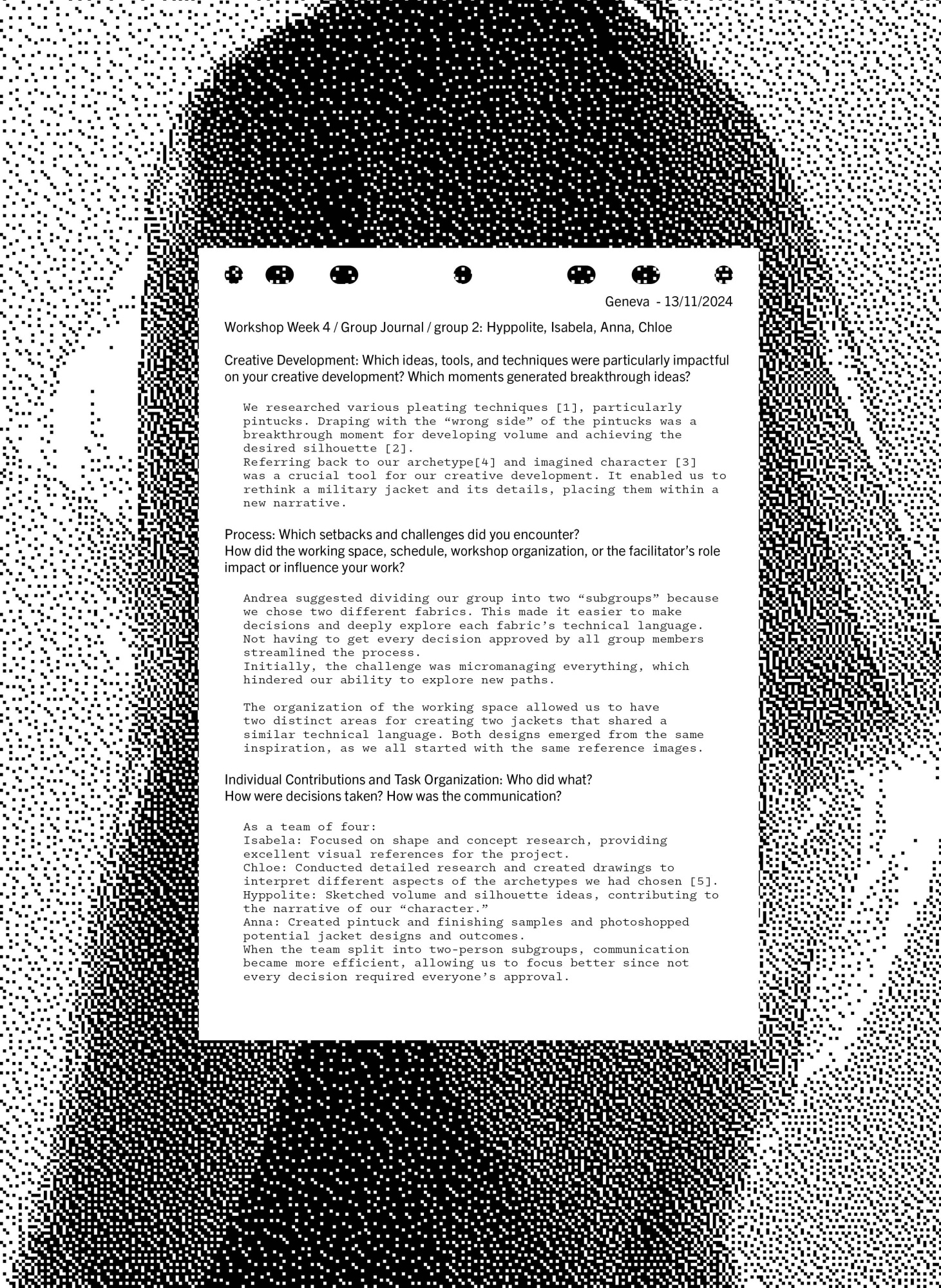 Participants were divided into groups, each further subdivided into teams according to specific creative languages – Coupe, Drawing, Textile – chosen by the participants based on their individual inclinations and motivations. This structure made it possible to observe and map the emergence of creativity not only at a domain-general level but also within domain-specific contexts. [1] Polina (Coupe Team, Group 5) drew inspiration from a vintage trench coat and reconstructed it along organic curves, later established as a group guideline. [2] Léo and Antonia (Coupe Team, Group 1) update the pinboard with photos from their first mock-up fitting. [3] Gabrielle (Drawing Team, Group 3) and Sofia (Coupe Team) review inspirational material to shape their work on day two. [4] Paula (Coupe Team, Group 4) begins draping on a dress form, seeking serendipitous ideas to share during feedback sessions. Photos Andrea Cammarosano and Catherine Smet.