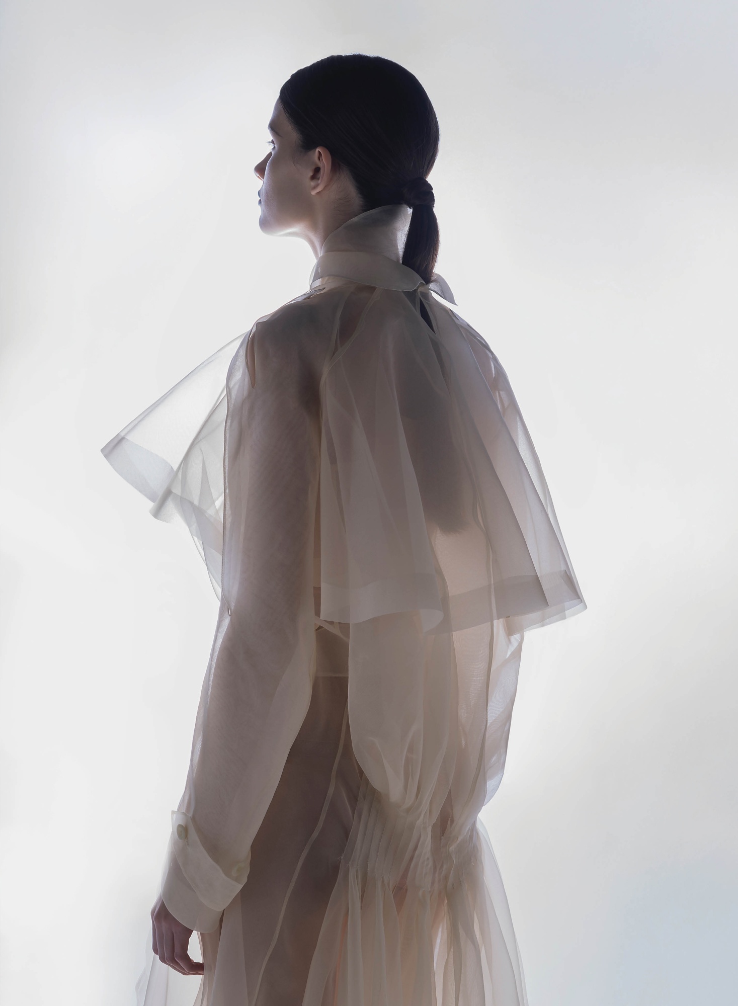 Garment and reflections by Hippolyte Laporte and Isabela Bueno, reinterpreting archival references through the material qualities of an organza fabric developed by Gruppocinque, Como. Throughout the activity, participants were also asked to keep diaries and observations on their individual experiences and their collaborative process. Fig. 3: Photo Alessandro Di Palma; Styling Leonardo Persico; Make-Up and Hair Cinzia Trifiletti; Talent Dasha Lalic at Di Next Management; Post Production Gloria Torquati. Shot at Illuminotecnica Media Lab, NABA, Nuova Accademia di Belle Arti, Milan.