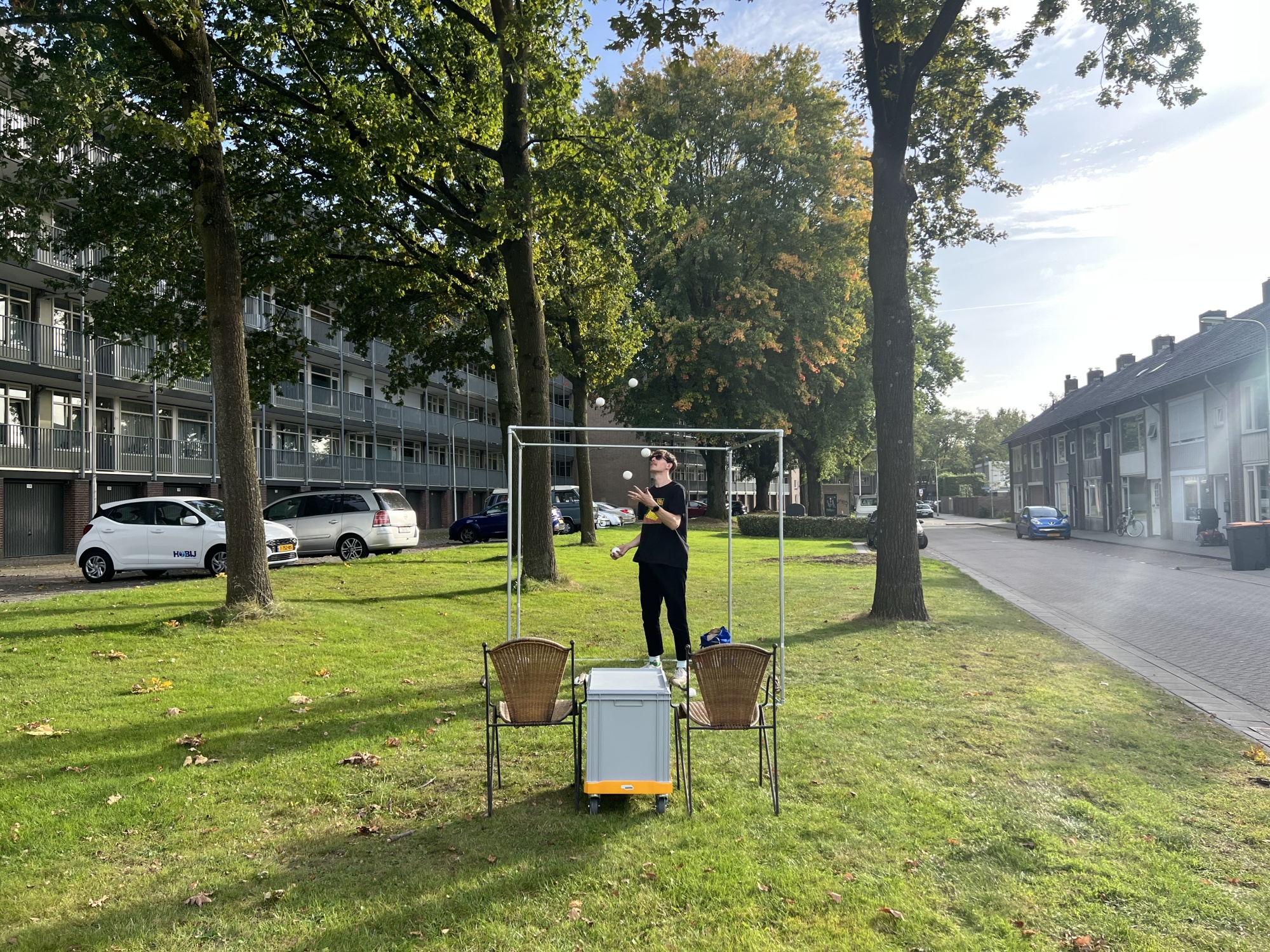 The proposals included:12 Visual artist Kamila Wolszczak (kamilawolszczak.com) invited participants to walk in the streets of Het Zand, collect found materials (soil, broken artefacts), and create artworks with them while sharing personal stories. Hannah Rogerson and Pieter Visser (teatime-company.com) focused on the notion of ‘home’, addressing both adults and children. Together with theatre maker and researcher Gerrie Fiers from FAA (www.linkedin.com/in/gerrie-fiers-b474907), I conducted a residency on the practice of public speaking. Sounds Like West was a residency focusing on collective music making, designed and facilitated by musician Maite van der Marel (www.collectingbeats.com). Juggling with Nature with circus artist Valentina Solari (www.valentina-circus.com) invited primary school students to experiment with playful juggling inspired by the plants of Wij West’s garden. Hungarian artist Orsolya Nemeth turned her status as a foreigner into a role-play game and invited participants to sit together around a large map of the area and introduce her to it in performative, imaginative ways.
