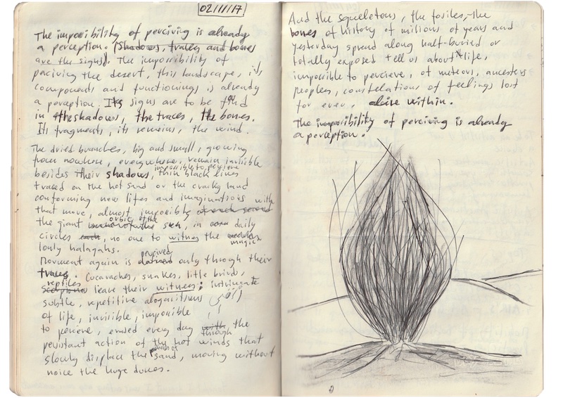 The impossibility of perceiving the desert, this landscape, its components and functioning, is already a perception. The signs are to be found in its traces: the remaining fragments, the fragmented remains, its bones.