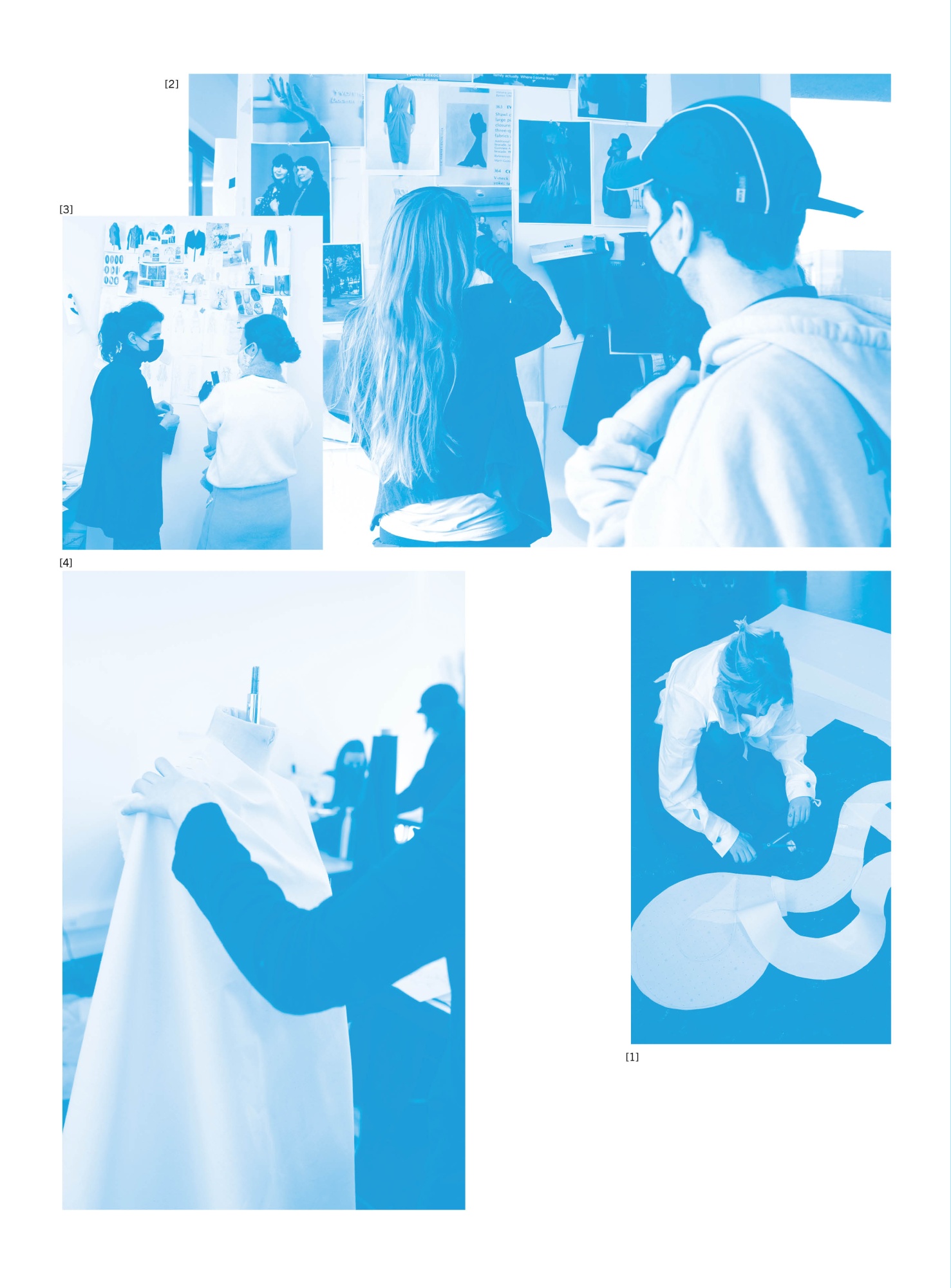 The activity was constantly observed in its evolution, from initial inputs to outputs; pictures of progress, intermediate artifacts, and pinboards used by participants to communicate tasks and ideas were collected and mapped, forming the core of the empirical PhD study material. [1] Sofia (Coupe Team, Group 3) prepares to cut fabric provided by the Textile Team, using a pattern she drafted by interpreting a sketch from the Drawing Team. [2] Jaden (Coupe Team, Group 2), inspired by the idea of boxy shapes, experiments with modular square-based pattern-making. His idea was further developed using laminated crochet squares by the Textile Team. [3] Alexander and Babette (Textile Team, Group 2) organize their colour and print concepts on the pinboard, starting from the idea of using a crochet sample as a stamp on bright orange fabric. Photos Andrea Cammarosano and Catherine Smet.
