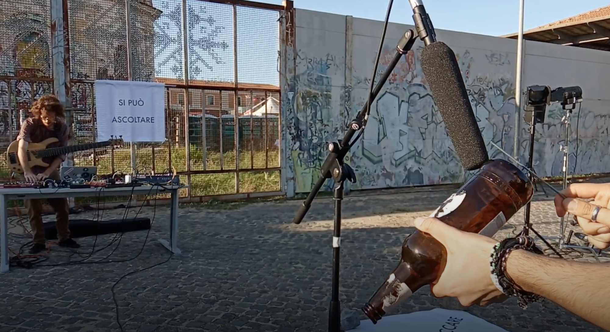 On 27 September 2024, [in situ] was presented in Campo Boario, a large square at the former Mattatoio di Testaccio, a decommissioned old slaughterhouse in Rome, partially repurposed into university facilities by certain Roman institutions while also partially consisting of occupied spaces and social centres. I was invited to perform by the Academy of Fine Arts (ABA).27 Having three shotgun microphones available, I tried to cover as much space as possible, capturing sound from a hedge where cicadas and birds were present; an area next to the Panottico, an octagonal structure with strong reverberation, where the main sounds came from vehicles and people passing by on an adjacent gravel road; and the courtyard of the ABA, where I had brought some materials collected on-site (Fig. 2).