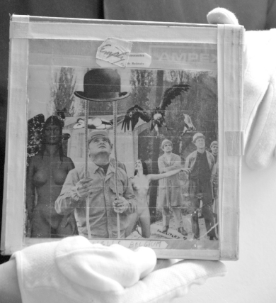 De overige sporen brengen niet veel meer verheldering. Voor zover mij bekend bestaat er geen boek noch collage van de Radzitzky met ‘…monautes’ ergens in de titel, en in 1969 deed Armstrong België niet aan. Wel was hij in Londen voor de opnames van de titeltrack van On Her Majesty’s Secret Service, de zesde James Bond-film. De Radzitzky kan hem er uiteraard zijn gaan bezoeken, en de collage kan inderdaad uit dat jaar stammen, maar het blijft allemaal giswerk. Op aanraden van Riccardi speurde ik nog even in de onlinecatalogus van het Louis Armstrong House Museum, en zo bleek dat ondanks Armstrongs eigen markering ‘Empty’, de doos toch een magneetband heeft bevat.4 Dit helpt in principe om het werk te dateren, aangezien opname en collage vaak uit eenzelfde periode stammen. De tape bevat in dit geval opnames van twee televisieshows uit 1970 en 1971 waarin Armstrong te gast was, dus naar alle waarschijnlijkheid is de collage iets later gemaakt dan de ‘69’ doet vermoeden, en ze is volgens Riccardi nog preciezer te dateren rond de lente of zomer van 1971. Helaas zijn deze opnames niet verder gerelateerd aan de collage, België of de Radzitzky, en ook de collage aan de achterkant van de Ampex-verpakking, gemaakt door een fan, een zekere William Hassan, die Armstrong de collage heeft geschonken, biedt geen verheldering.5