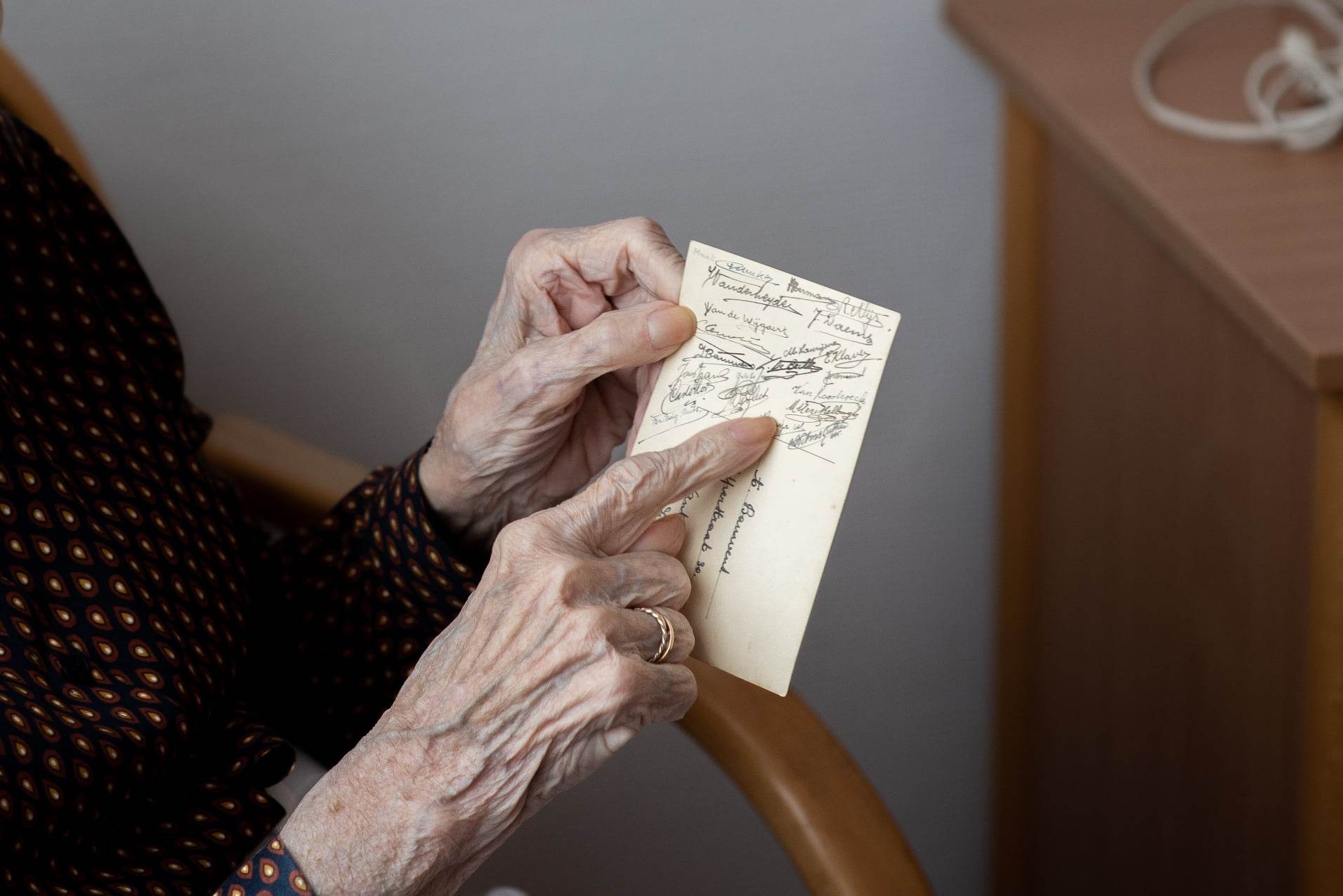 Een bewoonster toont een dierbare postkaart in woonzorgcentrum Het Huizeken van Nazareth, foto door Patricia Vanrespaille.